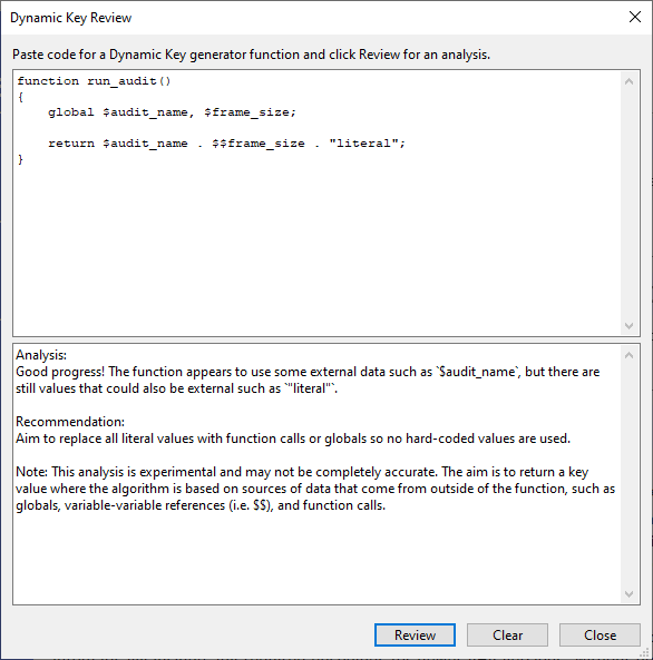 Paste the PHP code for one of your dynamic key functions into the upper text box, then click Review. After a few seconds the dialog will give a critique. The analysis identifies sources of data used by the function, and guides you to improve the function if necessary by making use exclusively of data that is available at runtime rather than hardcoded literal values. After a successful analysis, output will be similar to the screenshot below. Any errors will be shown instead. This example also illustrates the use of names that do not suggest a relation to key generation.